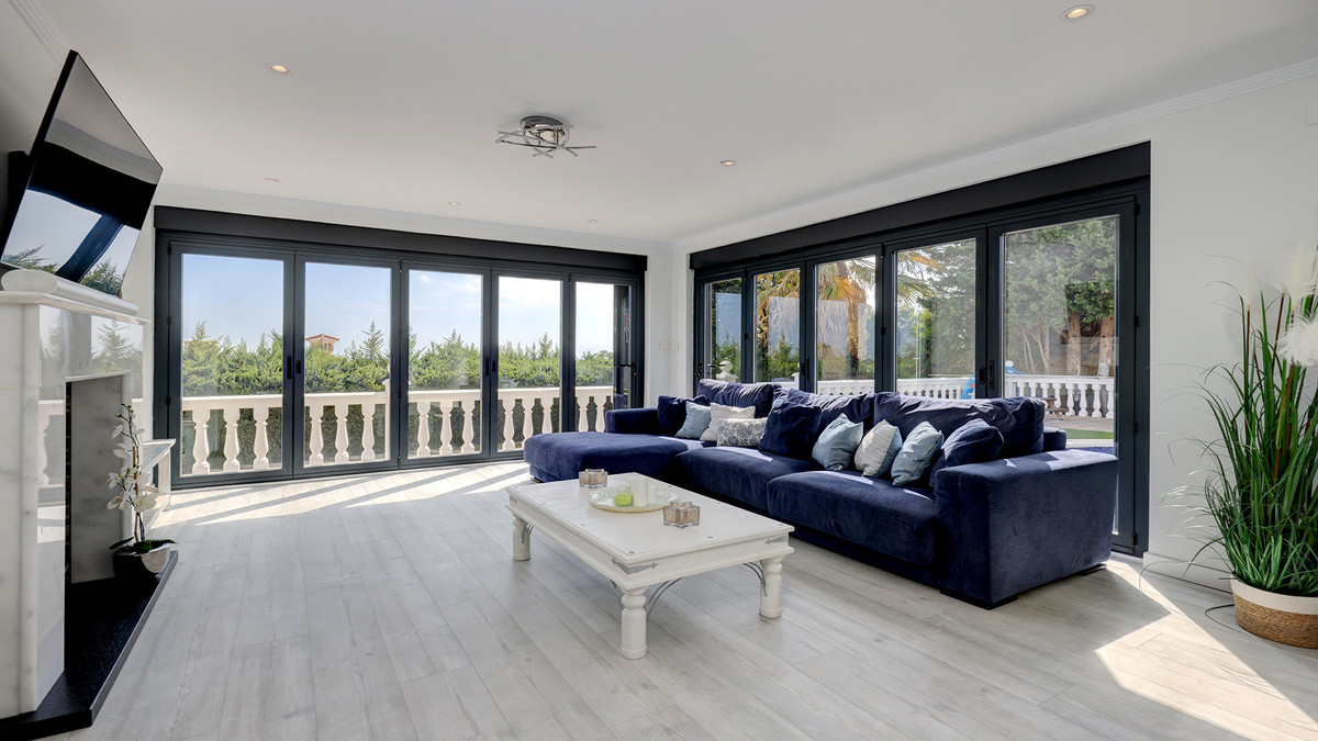 L'espace de vie, lumineux et aéré, s'ouvre sur une vaste terrasse de style véranda qui capte la lumière du soleil du lever au coucher du soleil. C'est l'endroit idéal pour se détendre, dîner en plein air ou recevoir des invités tout au long de l'année, tout en profitant de la vue et de la lumière naturelle.