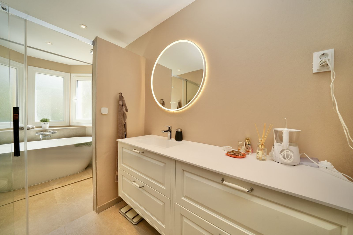 Au premier étage, on trouve trois belles chambres, dont une suite parentale avec salle de bains privative, baignoire moderne et accès à la terrasse. Les deux autres chambres se partagent une salle de bains. Deux des salles de bains et les toilettes invités ont été rénovées l'an dernier. La salle de bains du sous-sol est en cours de rénovation.