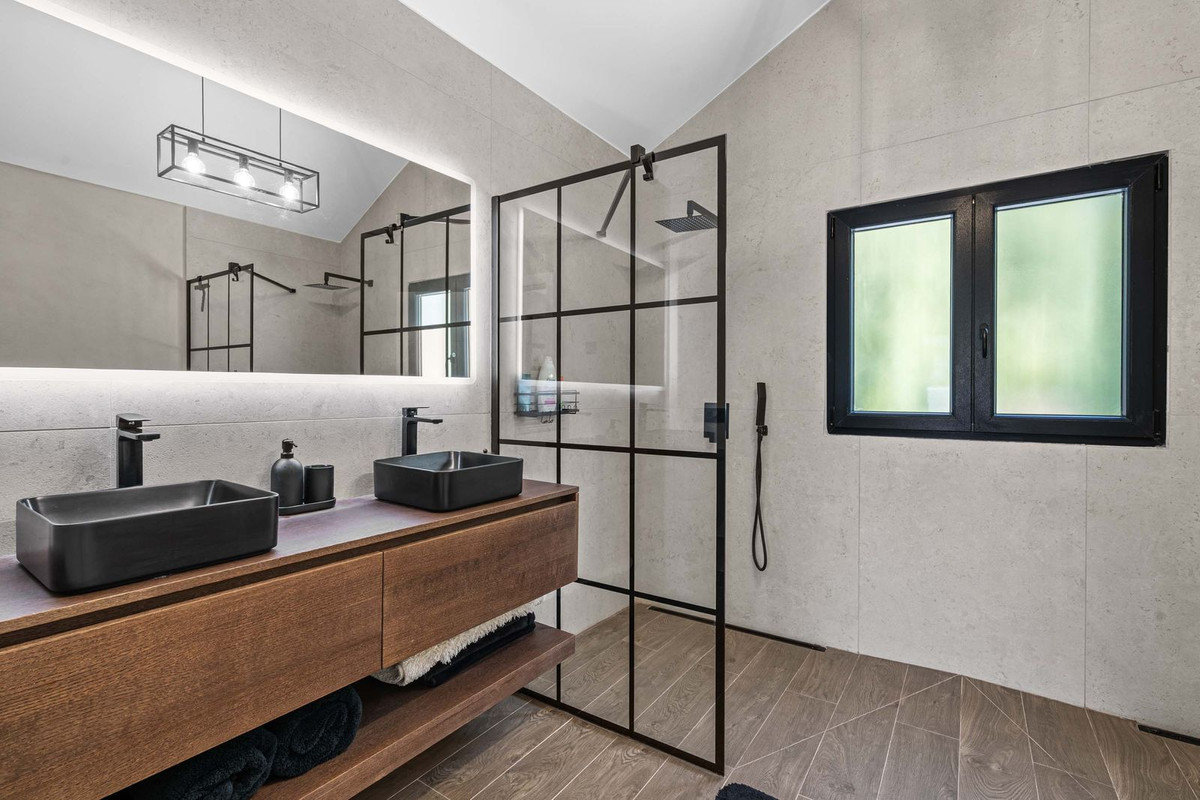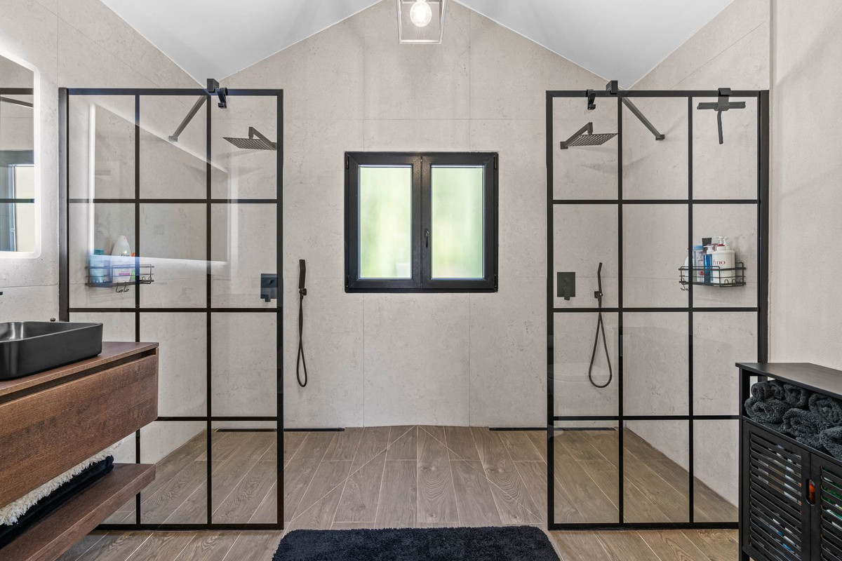 Le rez-de-chaussée abrite trois chambres, idéales pour une famille ou des invités, tandis qu'une chambre supplémentaire se situe à l'étage, offrant intimité et vue dégagée. Une cinquième chambre se trouve au sous-sol. Depuis l'étage, vous profiterez d'une vue sur la mer, tandis que la maison bénéficie principalement d'un environnement champêtre paisible, lui conférant une impression d'espace et de sérénité.