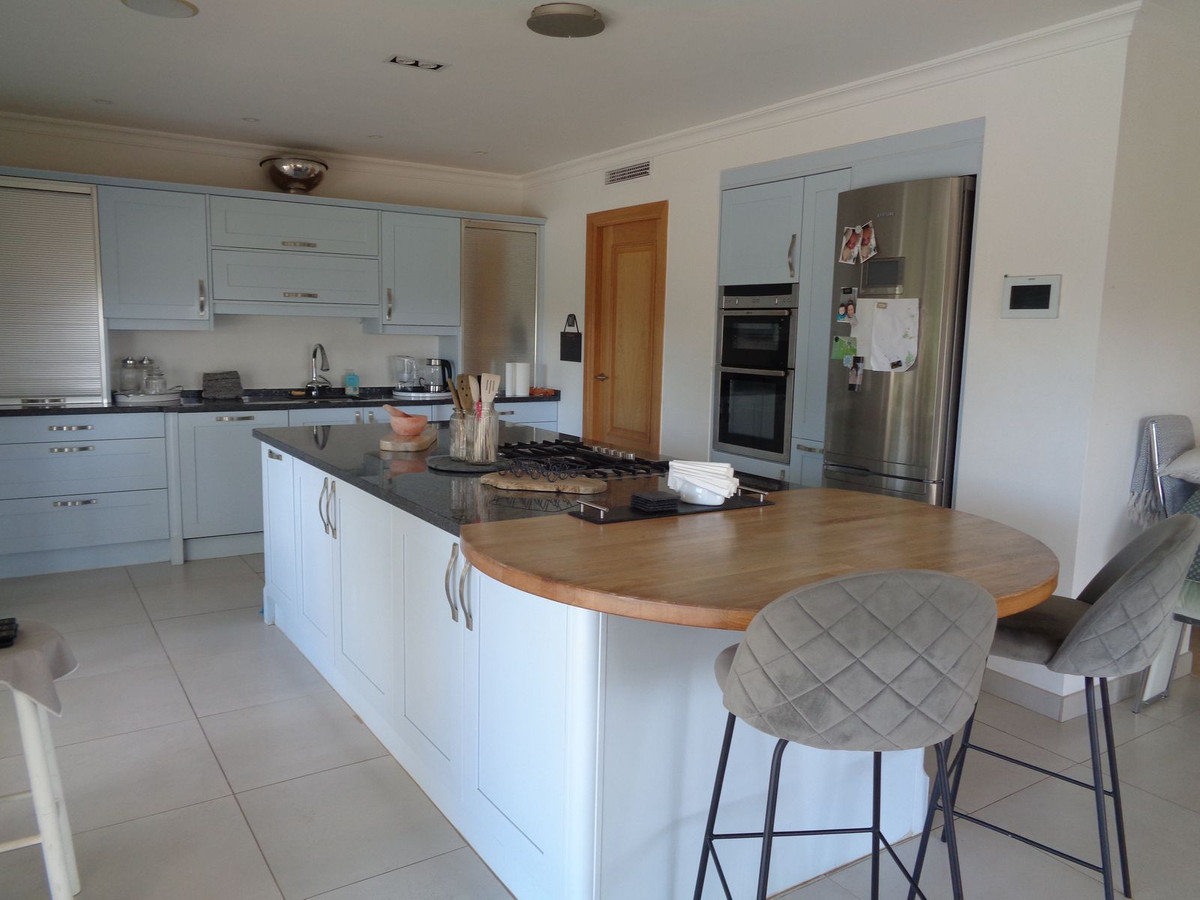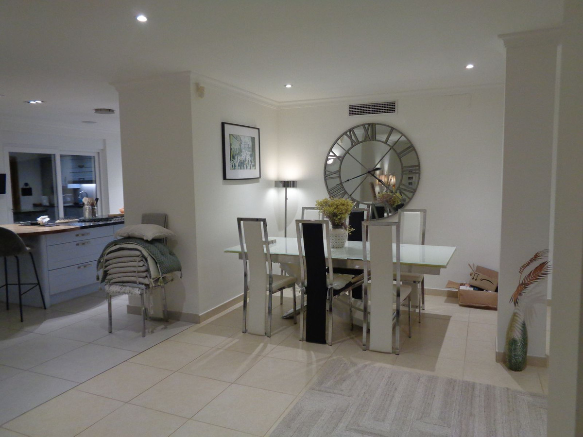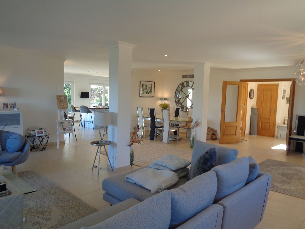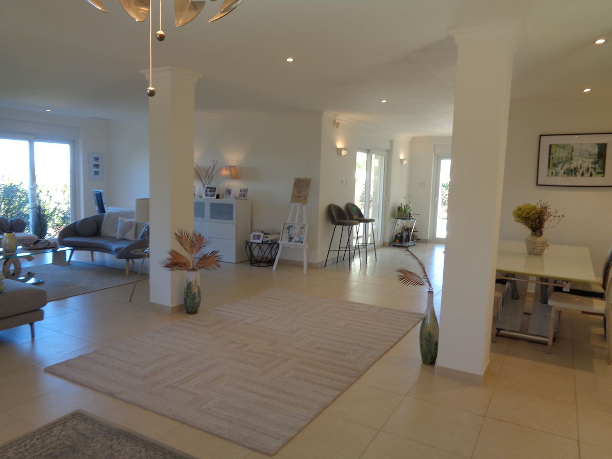 Un bel espace repas sépare le salon de la cuisine. La cuisine spacieuse est dotée d'un grand îlot central faisant office de coin repas et d'équipements modernes. Très accueillante et baignée de lumière, elle s'ouvre sur les terrasses, le jardin et la piscine grâce à trois portes-fenêtres.