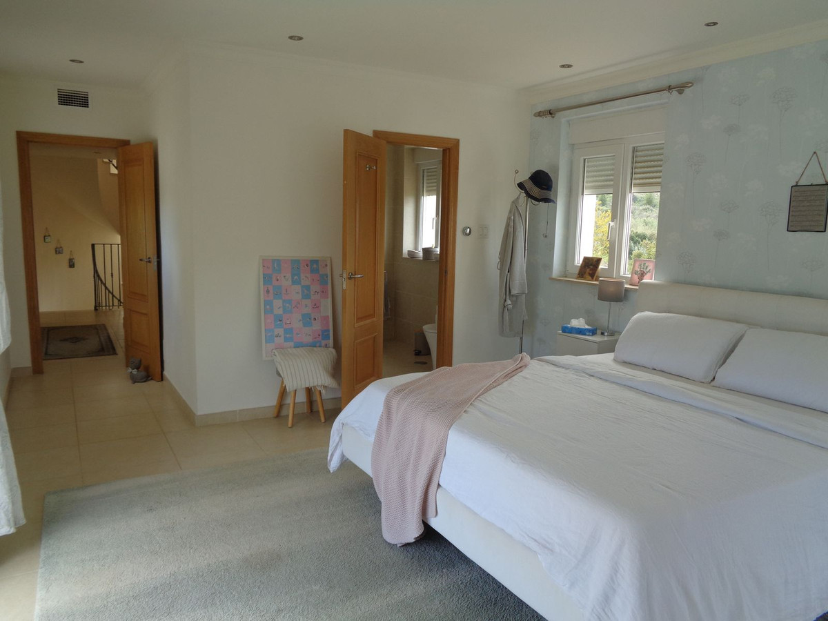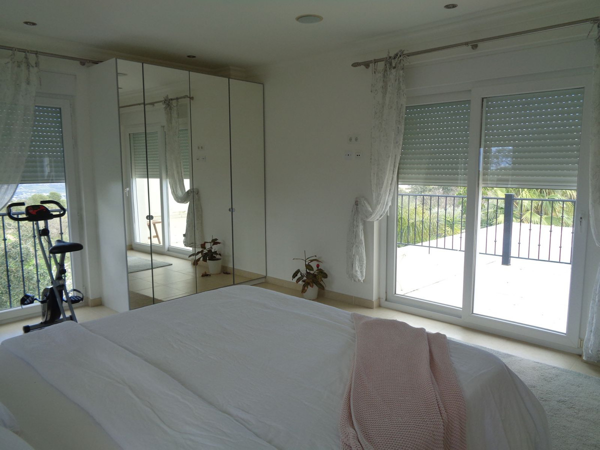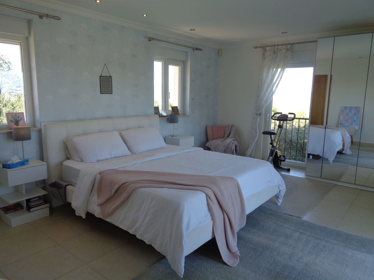 La salle de bains attenante comprend une baignoire, une douche séparée, des toilettes, un lavabo et un sèche-serviettes. Depuis la terrasse, admirez la vue spectaculaire sur le jardin soigné, la vallée et les montagnes environnantes.