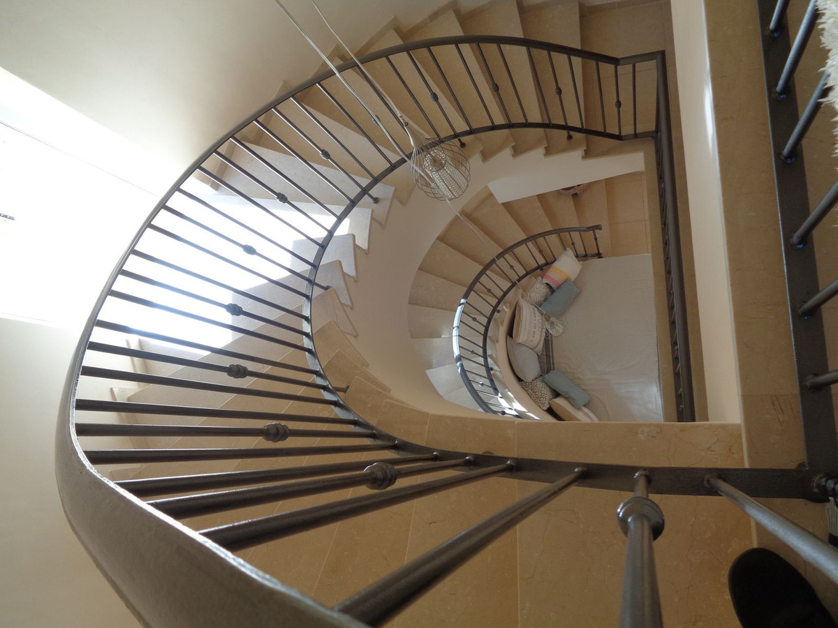 Depuis le palier, le large escalier en colimaçon se poursuit jusqu'au deuxième étage.