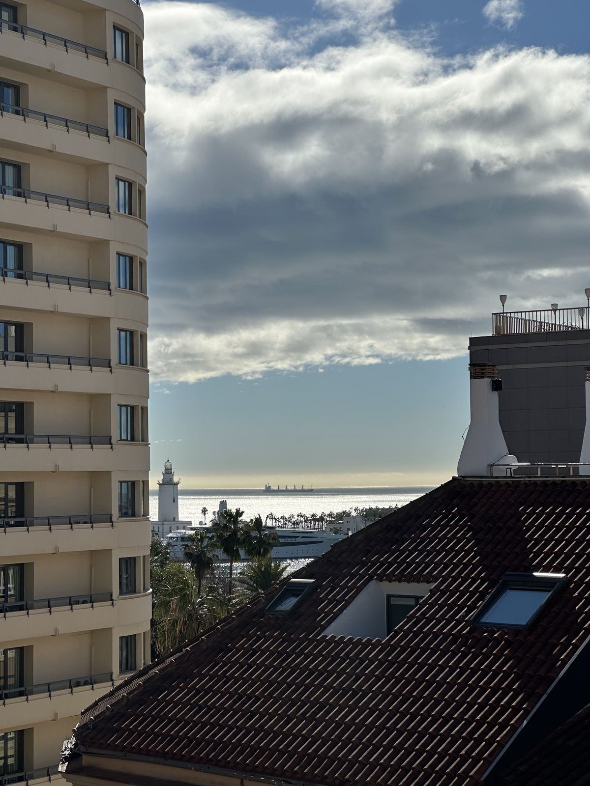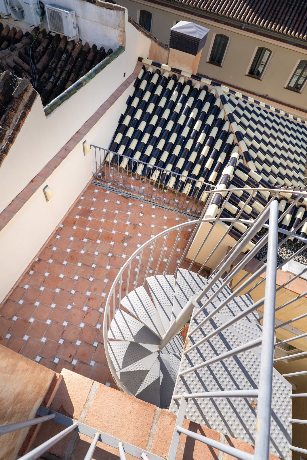 À l'étage supérieur, une seconde terrasse se trouve au même niveau que la troisième chambre. De là, un élégant escalier en colimaçon mène à la terrasse sur le toit. De cette position dominante, on profite d'une vue dégagée sur la cathédrale de Malaga, d'une vue partielle sur le port et la mer, ainsi que d'un panorama exceptionnel sur les toits du centre historique et les collines environnantes.