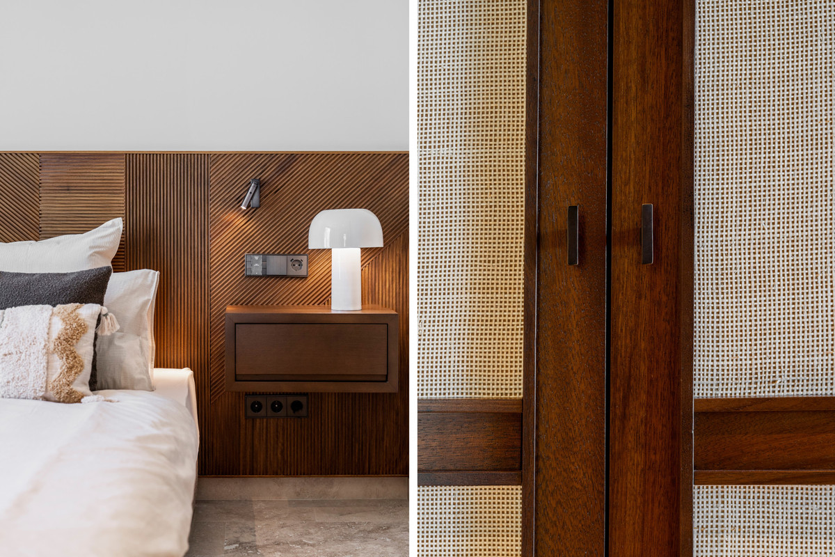 L'appartement est aménagé avec des matériaux de haute qualité et des touches de bois naturel, créant une atmosphère chaleureuse et accueillante.