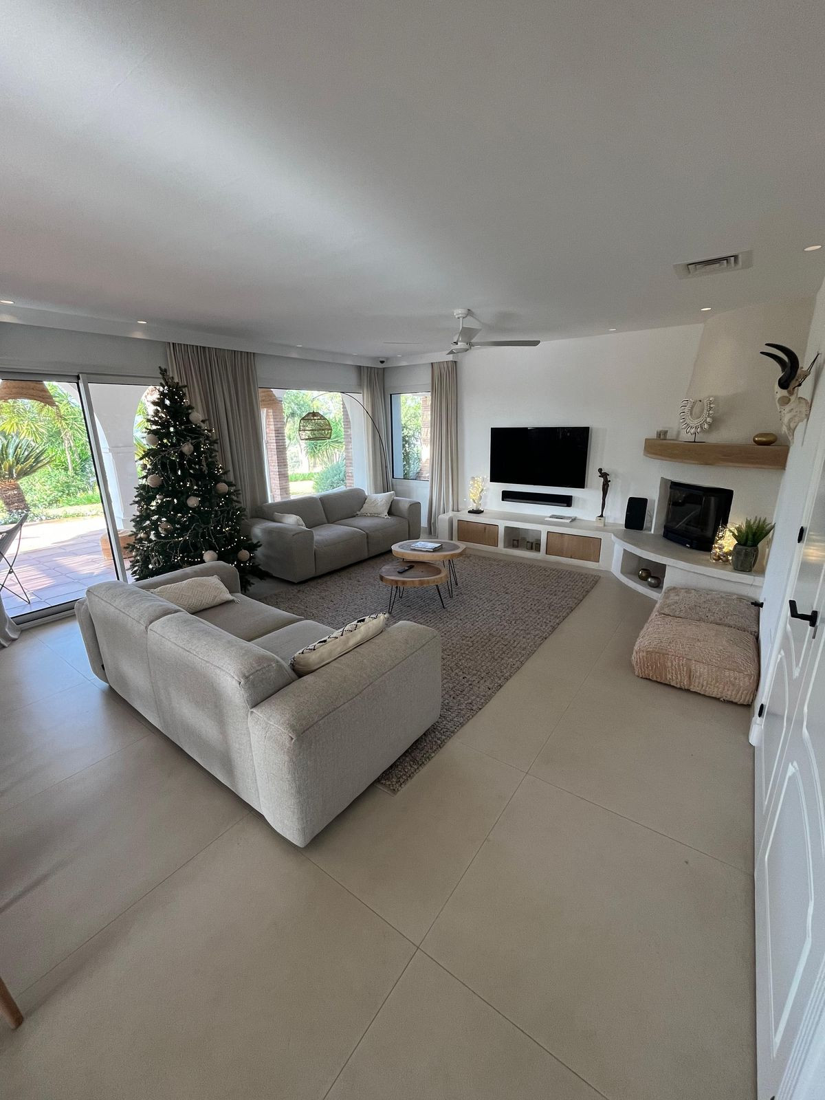 Au rez-de-chaussée, un hall d'entrée accueillant dessert un magnifique espace de vie ouvert comprenant salon et salle à manger, relié harmonieusement à une cuisine moderne entièrement équipée d'appareils haut de gamme : four, tiroir chauffant, deux réfrigérateurs, congélateur, plaques à induction, lave-vaisselle et micro-ondes. De là, on accède directement aux terrasses et au superbe jardin tropical paysager.