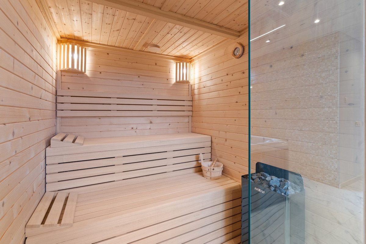 Le niveau inférieur est dédié au confort et aux loisirs, avec une salle de sport privée et un espace spa comprenant sauna, jacuzzi et hammam, ainsi que des espaces de divertissement, des logements pour le personnel, des rangements et des locaux techniques. La villa est équipée d'un chauffage au sol, d'une climatisation performante, de double vitrage et d'une cheminée. Son efficacité énergétique est optimisée grâce à des panneaux solaires photovoltaïques avec système de batteries FVE et un chauffe-eau solaire.