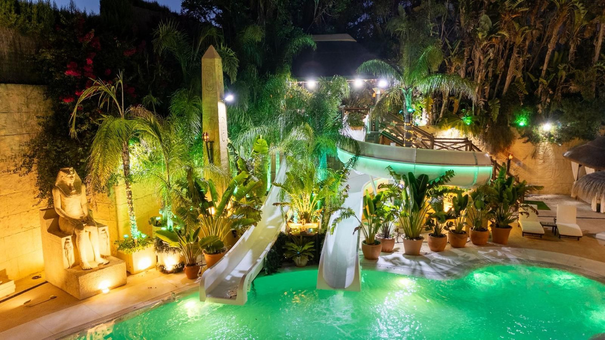 Située dans la zone G de Sotogrande Alto, cette vaste villa de luxe a été construite par son propriétaire actuel sur une période de 10 ans, avec des matériaux haut de gamme et une somptueuse sélection de lustres en cristal. Le grand hall d'entrée est orné de deux escaliers en marbre incurvés menant à l'étage supérieur, où se trouvent trois chambres, dont une suite parentale décorée sur le thème égyptien, avec des murs peints à la main, des moulures raffinées et des piliers en pierre massive. Un salon privé donne sur le jardin et la piscine. On y trouve également un dressing et une salle de bains attenante avec baignoire balnéo et double douche à l'italienne. Deux autres chambres spacieuses, chacune avec sa propre salle de bains, se trouvent à cet étage et donnent accès à la terrasse privée. De là, un escalier mène au solarium privé. Un ascenseur dessert les trois étages. Au rez-de-chaussée se trouvent un grand salon, une salle à manger et des portes donnant sur la terrasse couverte et la piscine. On y trouve également une cuisine de service avec cellier, une buanderie et un cellier. On y trouve également une salle de cinéma entièrement équipée avec huit fauteuils en cuir. Au demi-sous-sol se situe la suite de divertissement, décorée et peinte à la main sur le thème égyptien, avec une décoration assortie. Elle comprend une table de poker, des espaces de détente, un grand bar à cocktails, une salle de sport moderne avec vestiaires et douches, ainsi que deux autres chambres avec salles de bains privatives, également de style égyptien. Au centre du salon se trouve un théâtre miniature inspiré des théâtres du West End londonien, avec deux loges et 37 places. Luxueusement décoré dans un style théâtral, il est fourni avec l'ensemble des décors et accessoires nécessaires à une production de la comédie musicale « Le Fantôme de l'Opéra » et offre un système son et lumière complet, ainsi que la possibilité de projeter des films grâce au système de projection et une scène pour de petits concerts privés. Les travaux sur la villa et le terrain ne sont pas encore terminés, mais il s'agit d'une propriété unique et personnalisée, qui mérite d'être visitée par l'acheteur à la recherche d'une maison d'exception.