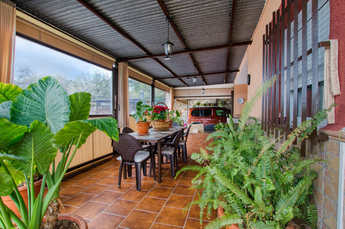 Spaces designed for enjoyment: The main residence features aluminum windows with double glazing and air conditioning throughout the entire house. Built on a single floor for maximum convenience, it offers a cozy living-dining room with a fireplace, a fully equipped kitchen, a full bathroom, and three spacious bedrooms. Additionally, it includes a porch with various enclosures: one fixed section made of aluminum with double glazing (fixed lower part and mobile upper part) and another section with an awning that can be opened during the summer.