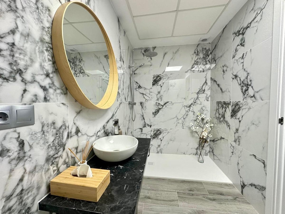 L'appartement comprend une salle de bains moderne et entièrement équipée, la climatisation et un parquet de haute qualité, soulignant son style contemporain et son confort.