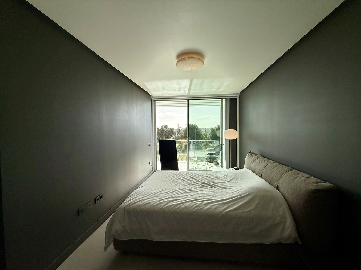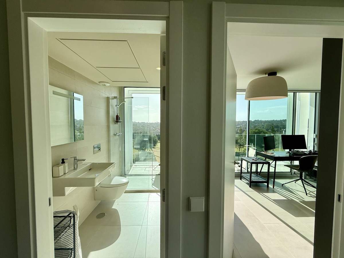 L'étage supérieur abrite une cinquième pièce lumineuse et polyvalente, actuellement aménagée en bureau, avec une salle de bains privative et un accès à une vaste terrasse sur le toit. De là, la vue panoramique s'étend sur le golf et la mer, offrant un cadre idéal pour les repas en plein air, la détente ou l'installation d'un spa privé.