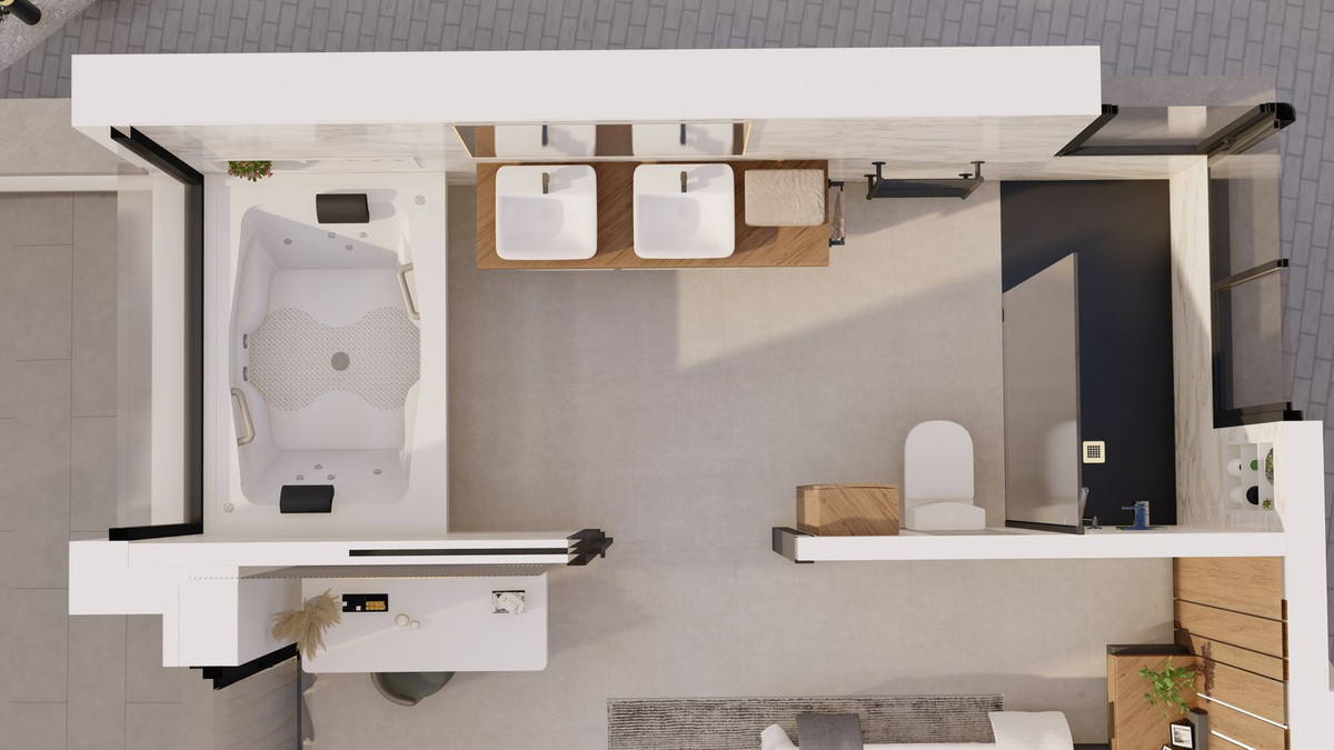 Pour plus de commodité, une salle de bain extérieure est aménagée près de la piscine. L'étage supérieur comprend trois chambres, chacune avec sa propre salle de bain, garantissant ainsi intimité et confort à tous les occupants. La villa bénéficie également d'équipements de pointe en matière d'efficacité énergétique, tels que le chauffage au sol et la technologie aérothermique, ainsi que des panneaux solaires pour une consommation d'énergie réduite au maximum.