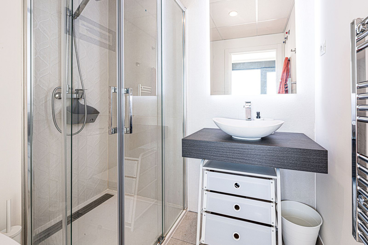 As one of the best houses on the complex, this townhouse offers a total of 4 bedrooms and 3 bathrooms. The private garage with two parking spaces leads directly into the house and the converted basement, which offers plenty of practical storage space. On the ground floor is the main entrance, the customized, open-plan designer kitchen with state-of-the-art equipment, a guest toilet and the living and dining area with wonderful views of the sea and Gibraltar. In the garden area, the south-facing orientation allows you to enjoy countless hours of sunshine on the terrace or in the private infinity pool.