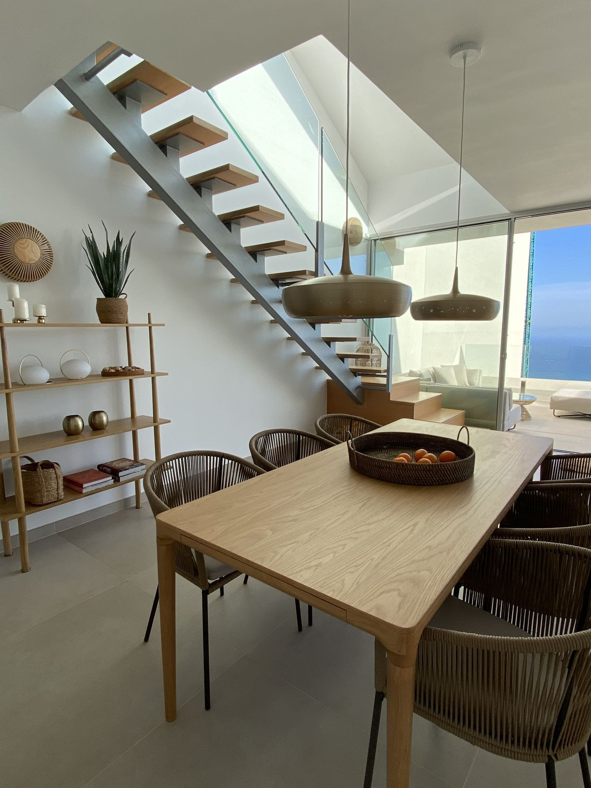 En entrant dans la propriété, vous découvrirez un hall d'entrée élégant qui s'ouvre sur un vaste et lumineux espace de vie décloisonné comprenant salon et salle à manger. La cuisine raffinée, de conception italienne, est entièrement équipée d'appareils haut de gamme, dont un système de filtration d'eau par osmose inverse. De larges baies vitrées coulissantes donnent directement sur une généreuse terrasse où vous pourrez profiter d'une vue imprenable sur la mer et d'un cadre de vie extérieur exceptionnel.