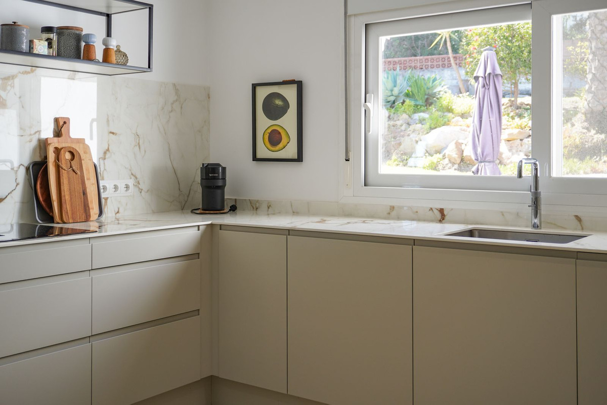 La cuisine a été entièrement rénovée il y a trois ans et est équipée de meubles Designa Kitchen de style nordique, avec des placards et des tiroirs élégants alliant fonctionnalité et confort. Elle comprend également des appareils électroménagers neufs, dont un réfrigérateur combiné extra-large, une plaque de cuisson vitrocéramique avec hotte intégrée, un nouveau revêtement de sol et un système Quooker fournissant de l'eau bouillante instantanément.