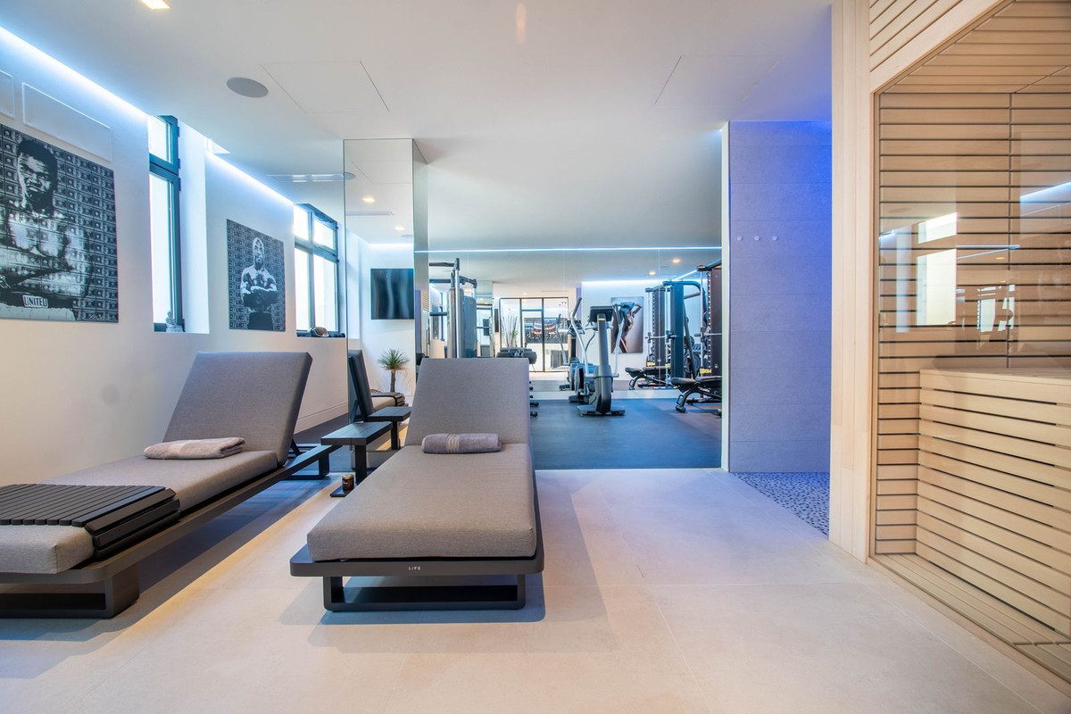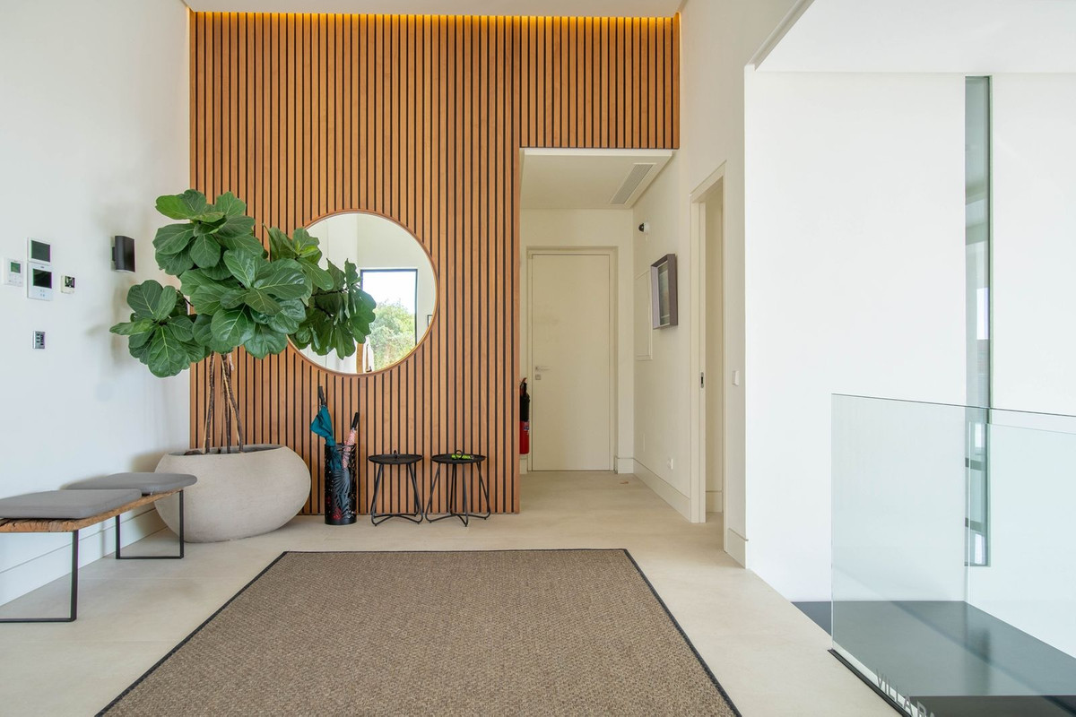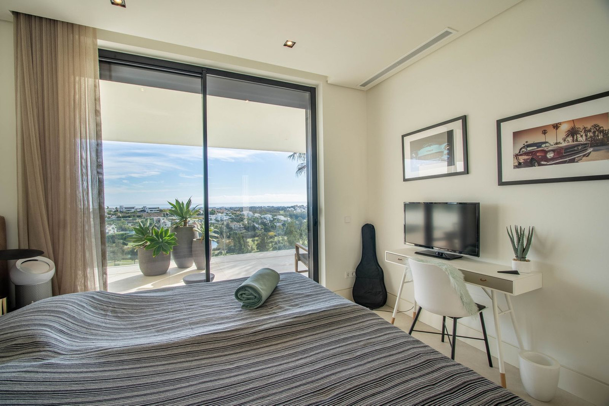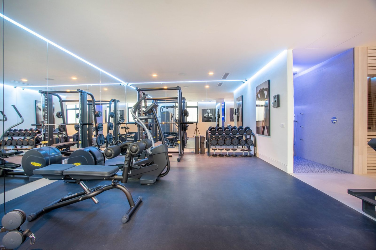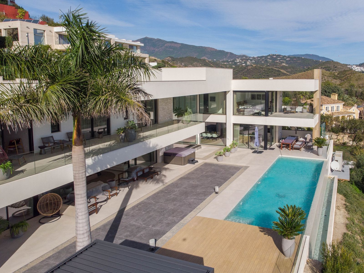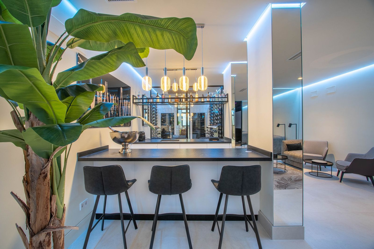 La propriété dispose également de spacieuses terrasses couvertes et découvertes avec vue panoramique sur la mer, la montagne et le golf, d'une incroyable piscine à débordement, d'un jacuzzi, d'une cuisine extérieure et d'un barbecue. La terrasse principale a été totalement transformée avec de nouveaux carrelages et des lumières LED qui peuvent être changées dans n'importe quelle couleur. .