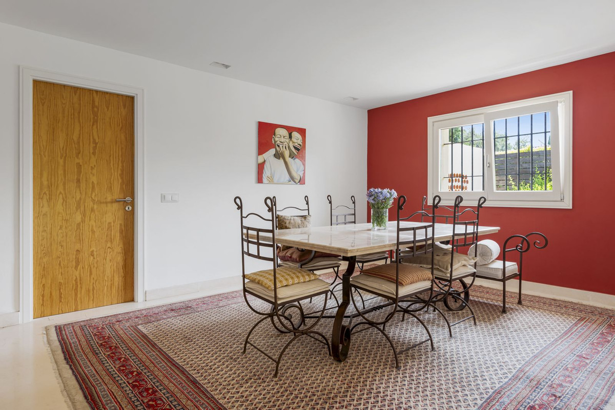 En entrant, vous êtes accueilli par un hall d'entrée à double volume qui mène à une spacieuse cuisine ouverte et un salon formel, tous deux s'ouvrant sur un patio couvert avec accès aux jardins et à la piscine. Le rez-de-chaussée comprend également une salle à manger formelle, une buanderie séparée, une salle de bains de service et de nombreux espaces de rangement. Dans l'aile droite, se trouvent une très grande chambre principale avec dressing, salle de bains en suite et accès direct aux jardins et à la piscine, un bureau privé, ainsi qu'une suite privée supplémentaire avec une chambre et salle de bains. salle de bains privative.