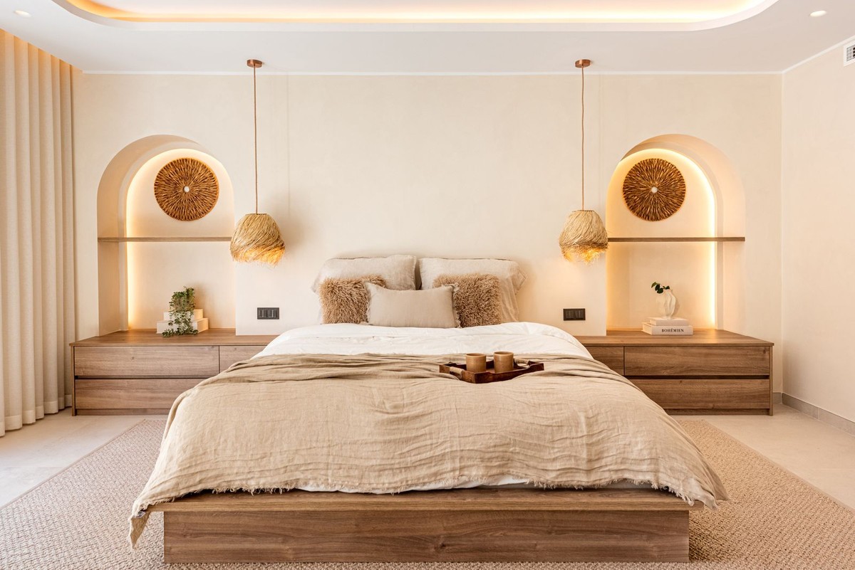 Les espaces extérieurs offrent un véritable havre de paix. La piscine d'inspiration balinaise crée une oasis de tranquillité, tandis que la spectaculaire terrasse sur le toit avec cuisine extérieure offre une vue panoramique imprenable sur la mer Méditerranée et l'emblématique montagne de La Concha – idéale pour recevoir ou profiter du climat exceptionnel de Marbella tout au long de l'année.