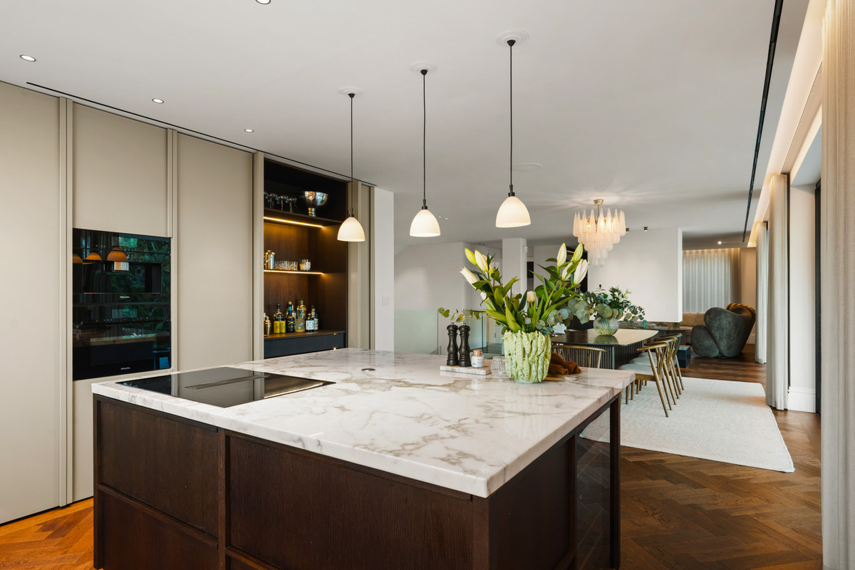 La cuisine est équipée d'appareils Miele haut de gamme et complétée par un élégant bar. Une arrière-cuisine/cuisine de chef séparée et dissimulée offre un espace très pratique, idéal pour recevoir et préparer des repas tout en préservant l'élégance de la pièce de vie principale.