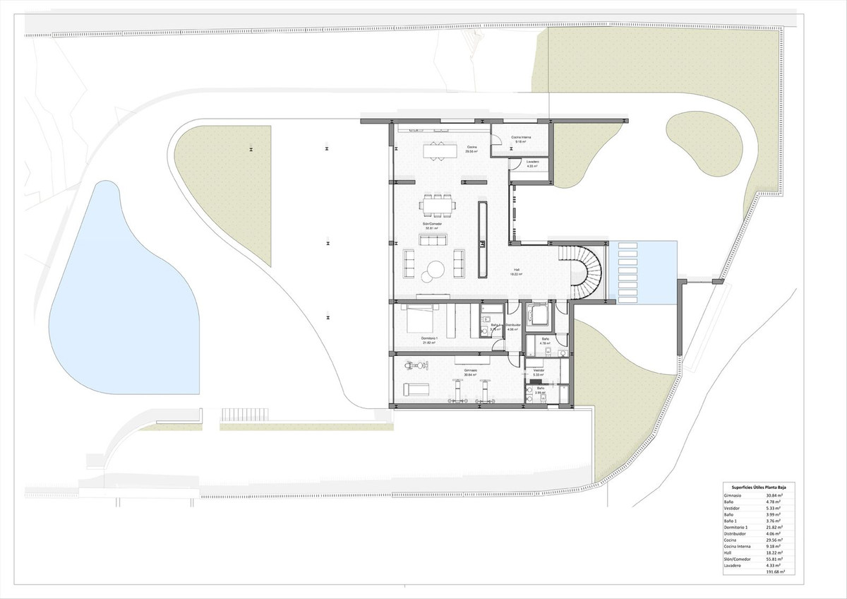 Le projet comprend cinq grandes chambres, dont une suite parentale spacieuse, plusieurs espaces de vie, une salle de sport privée, des espaces de service et un élégant escalier central qui constitue un élément architectural clé.
