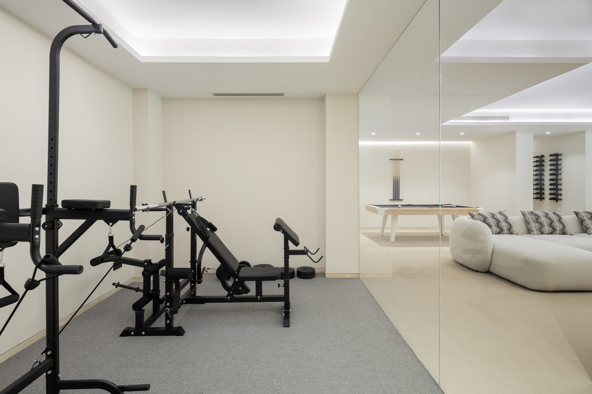Le niveau inférieur est dédié aux loisirs et à la fonctionnalité : il comprend une salle de sport entièrement équipée, une cave à vin sur mesure, un second salon et une cuisine supplémentaire avec coin bar. Ce niveau abrite également deux chambres d'amis avec salle de bains privative et accès direct à une piscine secondaire et aux jardins paysagers, offrant ainsi un havre de paix aux invités. Un garage pour trois voitures et des toilettes complètent cet étage.