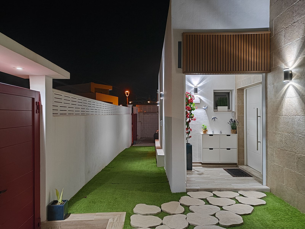 — Espace latéral aménagé pour une terrasse ou un espace repas extérieur