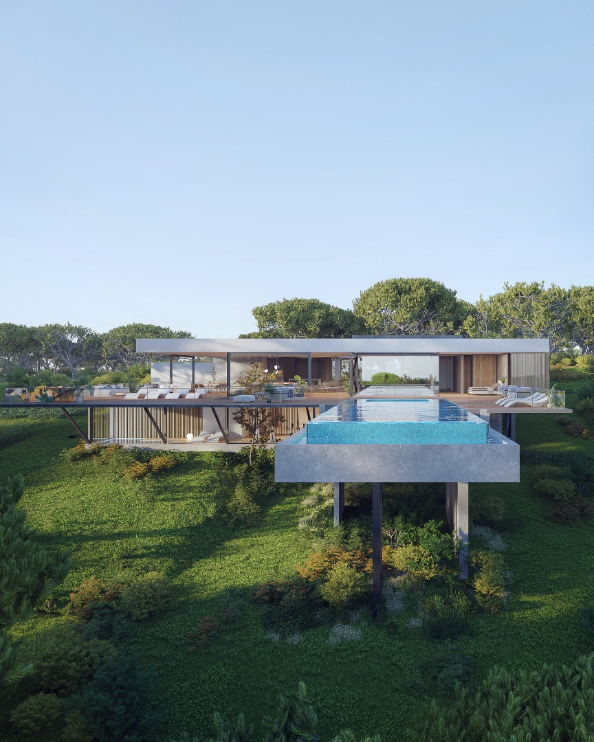 La villa s'étend sur plusieurs niveaux, avec un espace de vie lumineux et ouvert au dernier étage. Ce niveau donne directement sur une terrasse couverte et des espaces extérieurs offrant une vue panoramique. Le niveau inférieur abrite les suites parentales et est accessible par ascenseur ou par escalier. La conception permet également d'ajouter des options telles qu'une piscine intérieure et une salle de sport privée, selon vos besoins.